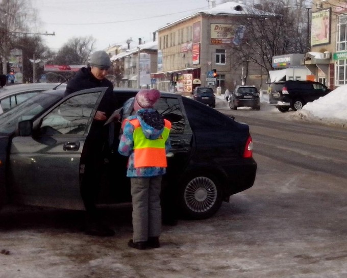 Дети поздравляли всех пешеходов и водителей-мужчин с Днем защитника Отечества и вручали им от ГИБДД комплект памяток о безопасности дорожного движения и издание правил дорожного движения в самой последней редакции, со всеми изменениями.