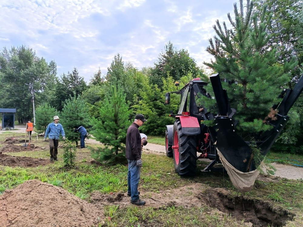 Работы по пересадке молодых сосен осуществляет Комбинат благоустройства. Благодаря приобретённому новому оборудованию – пересадчику деревьев, работы по озеленению нашей территории будут проходить быстрее, эффективнее и максимально безопасно для растений.