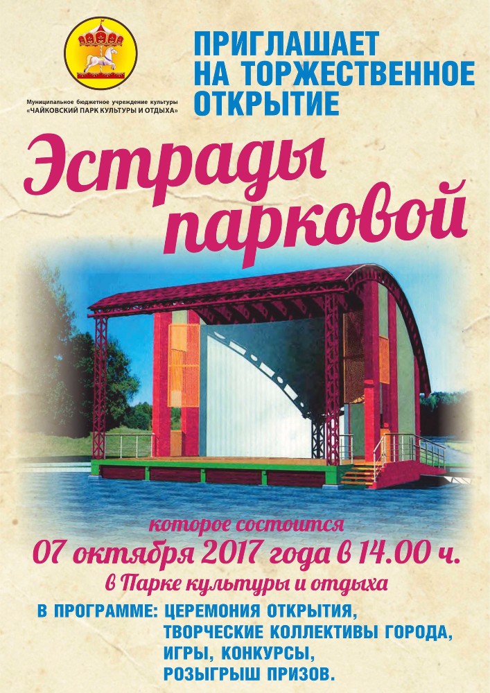Уже в ближайшую субботу, 7 октября, жителей и гостей города приглашают на торжественное открытие эстрады парковой в Чайковский парк культуры и отдыха. После официального открытия, сцену «обновят» творческие коллективы города, танцевальный фитнес «Zumba». Кроме того, гостей парка ожидают игры, конкурсы и розыгрыш призов.