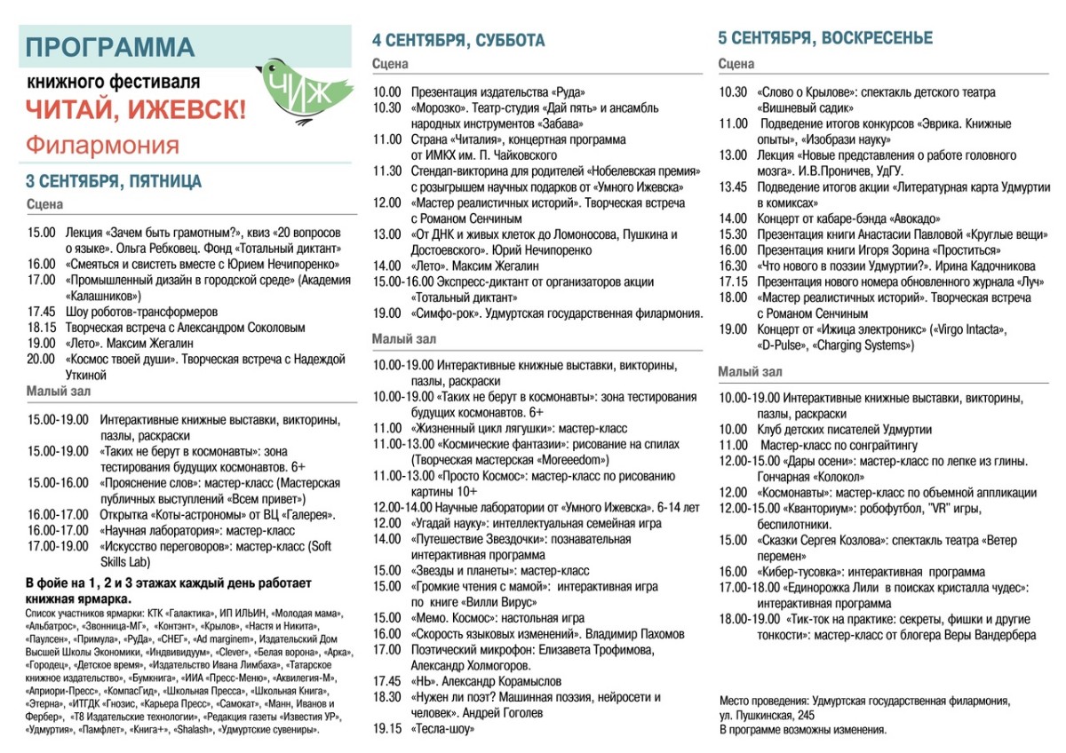 В этот раз «ЧиЖ» подготовил для жителей и гостей Ижевска насыщенную научно-познавательную программу: экспедиции по страницам книг, творческие встречи, концерты, демонстрации научных достижений Ижевска и много других открытий. Здесь можно задать вопросы писателям, ученым, журналистам, популяризаторам науки из Москвы, Санкт-Петербурга и Екатеринбурга.