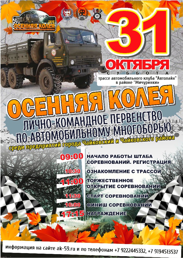 31 октября в 11.00 на трассе автомобильного клуба «Автолайн» в районе «Мичуринки» состоится открытие традиционного лично-командного первенства по автомобильному многоборью среди предприятий города Чайковский и Чайковского района – «Осенняя колея-2015».