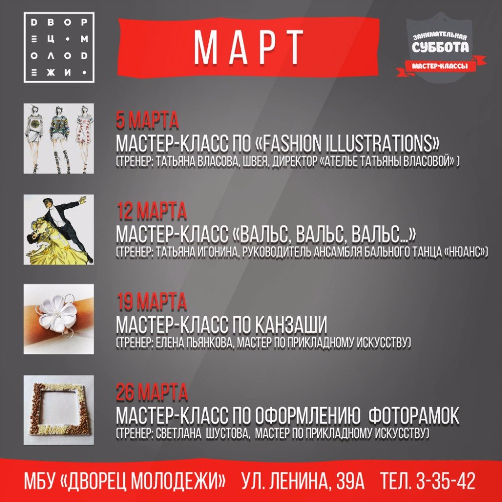 Февраль ещё не закончился, а организаторы «Занимательных суббот» уже составили расписание мастер-классов на март. Напомним, проект «Занимательная суббота» проходит во Дворце молодёжи по субботам и направлен на полезное времяпрепровождение, общение, узнавание чего-то нового. Возможно, на занятиях вы сделаете для себя не мало новых открытий.