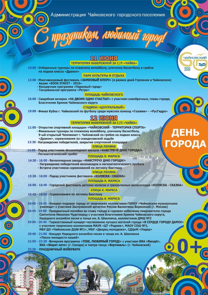 Празднование Дня города в Чайковском начнётся 11 июня. С утра за санаторием-профилакторием «Чайка» по традиции состоятся отборочные соревнования по пляжному волейболу, уличному баскетболу и открытому чемпионату города по гребле на лодках класса «Дракон».