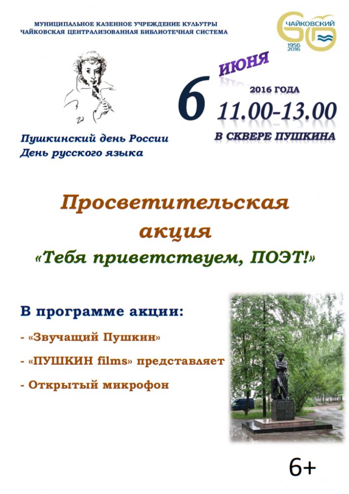 6 июня – день рождения Александра Сергеевича Пушкина, который ежегодно отмечается как Пушкинский день. В этом году исполнится 217 лет со дня рождения поэта. Сотрудники чайковских библиотек приготовили для жителей города и почитателей таланта великого поэта просветительскую акцию «Тебя приветствуем, поэт!». Мероприятие состоится в сквере у памятника А.С. Пушкину в 11:00.