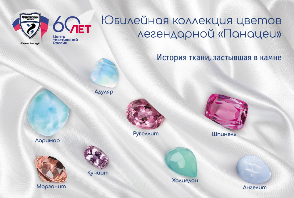 В честь 60-летнего юбилея компании «Чайковский текстиль» была создана коллекция цветов на легендарной ткани «Панацея»: восемь новых цветов получили названия драгоценных камней. Это самые актуальные и модные оттенки в пастельных тонах, наиболее востребованные сегодня заказчиками для легкой группы тканей.
