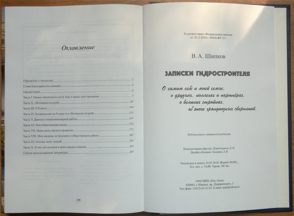А совсем недавно Владимир Шипков подарил в фонд Центральной библиотеки свою вторую книгу «Записки гидростроителя». Она вышла в ижевском издательстве «Бон-Анца» тиражом всего сто экземпляров.