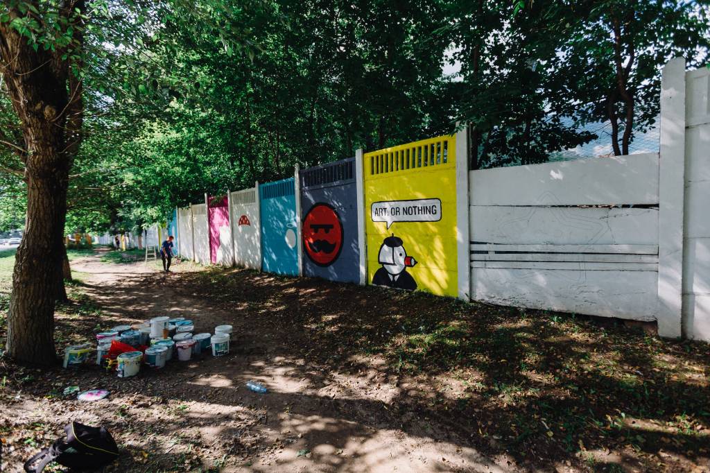 Фестиваль действительно вышел длинным. Готовить «холсты»-заборы - очищать от объявлений, покрывать грунтовкой - начали ещё 10 июня. Потом по эскизам художников волонтеры стали рисовать граффити. Но из-за обильных осадков работы затянулись. В результате последний забор докрашивали 28 июля.