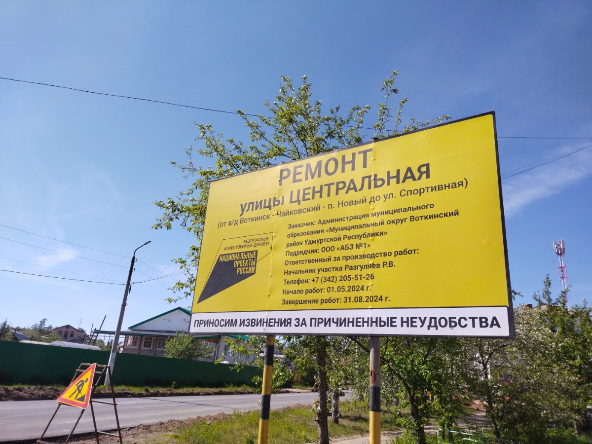 Информационный щит, появившийся в центре поселка в конце мая, многих ввел в заблуждение. Он сообщал о проведении капитального ремонта улицы Центральная «от автодороги Воткинск – Чайковский – п. Новый – улица Спортивная». По факту же в начале июня начался ремонт дорожного полотна от центральной остановки до пересечения с улицей Спортивной, а дорога у въезда в поселок так и стоит с ямами и ухабами.