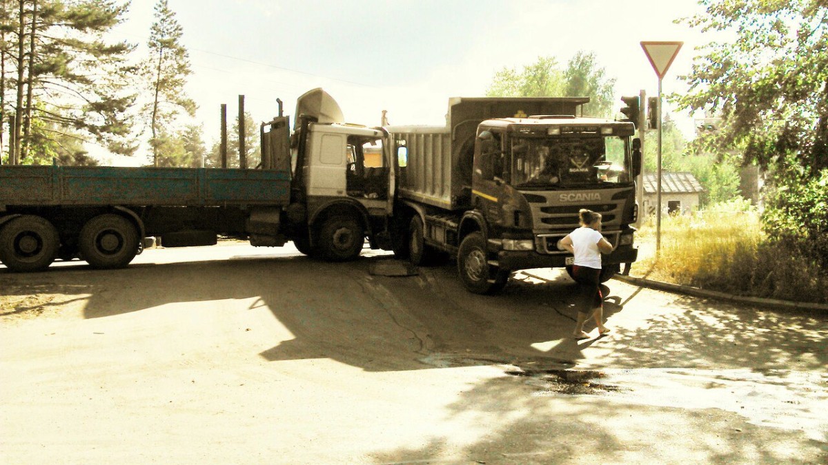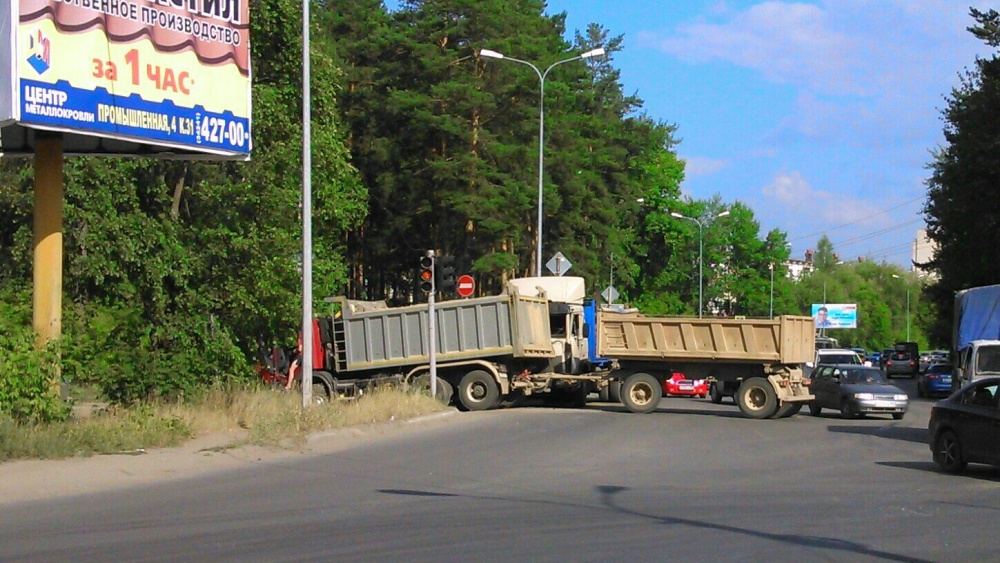 Столкновение двух грузовых автомобилей значительно затруднило движение транспорта. Просим автовладельцев отнестись к этому с пониманием.