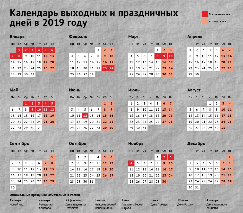 Согласно производственному календарю России, в декабре 2018 года в стране 21 рабочий и 10 выходных дней. В январе 2019 года 17 рабочих и 14 выходных дней.