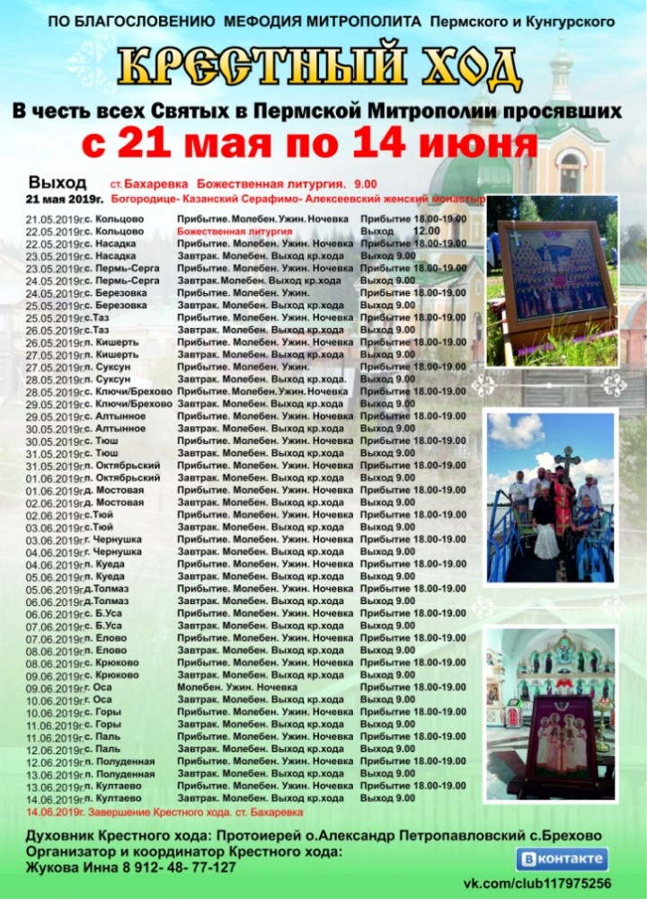 Крестный ход в честь всех Святых Пермской Митрополии просиявших отправится в путь 21 мая после на утренней Божественной литургии в Покровском Храме села Бахаревка. Начало в 08.00, отправление в дорогу в 11.00. Ежедневно верующие планируют проходить по 20-35 км. Завершится Крестный ход 14 июня.
