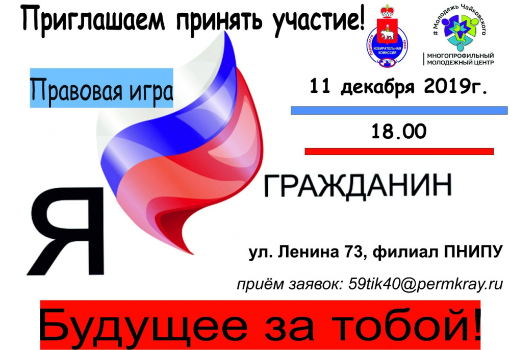11 декабря Территориальная избирательная комиссия Чайковского городского округа и «МБУ «Многопрофильный молодежный центр» в Чайковском филиале Пермского национального исследовательского политехнического университета проведут правовую игру «Я – гражданин».