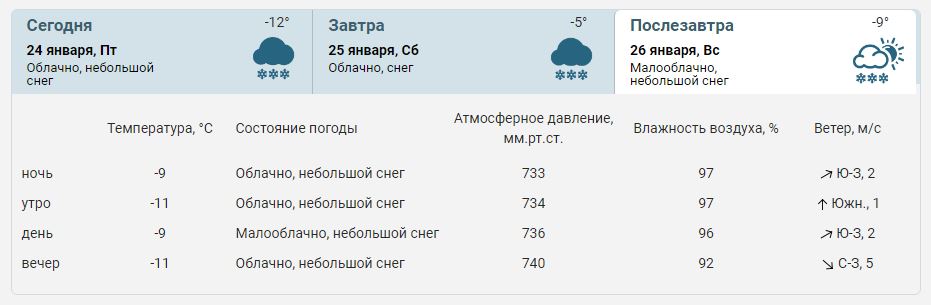 В пятницу, 24 января, продолжится заток относительно холодного воздуха с северо-запада. Ожидается небольшой снег, температурный фон составит -7…-12° в течение дня, вечером возможно похолодание до -15…-17° в случае образование слабовыраженного гребня повышенного давления.