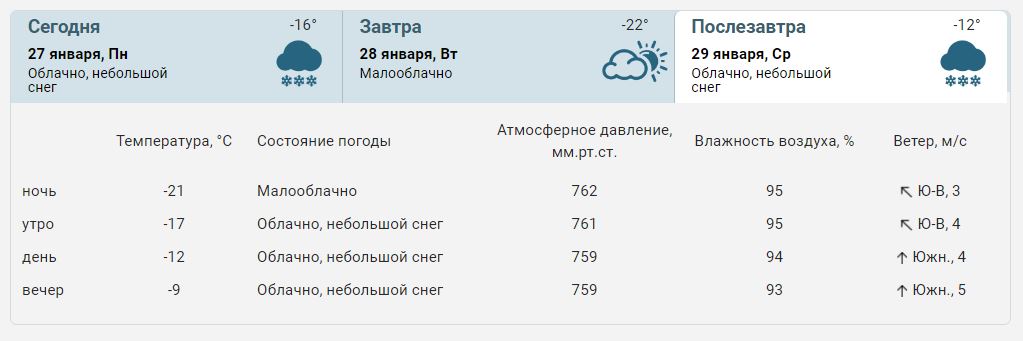 Днём будет малооблачно, но температура почти не будет повышаться. С севера продолжит распространяться очень холодный воздух с температурой ниже -20 °С. В краевой столице температура останется на уровне около -20°С, по краю — -18… -23°С.