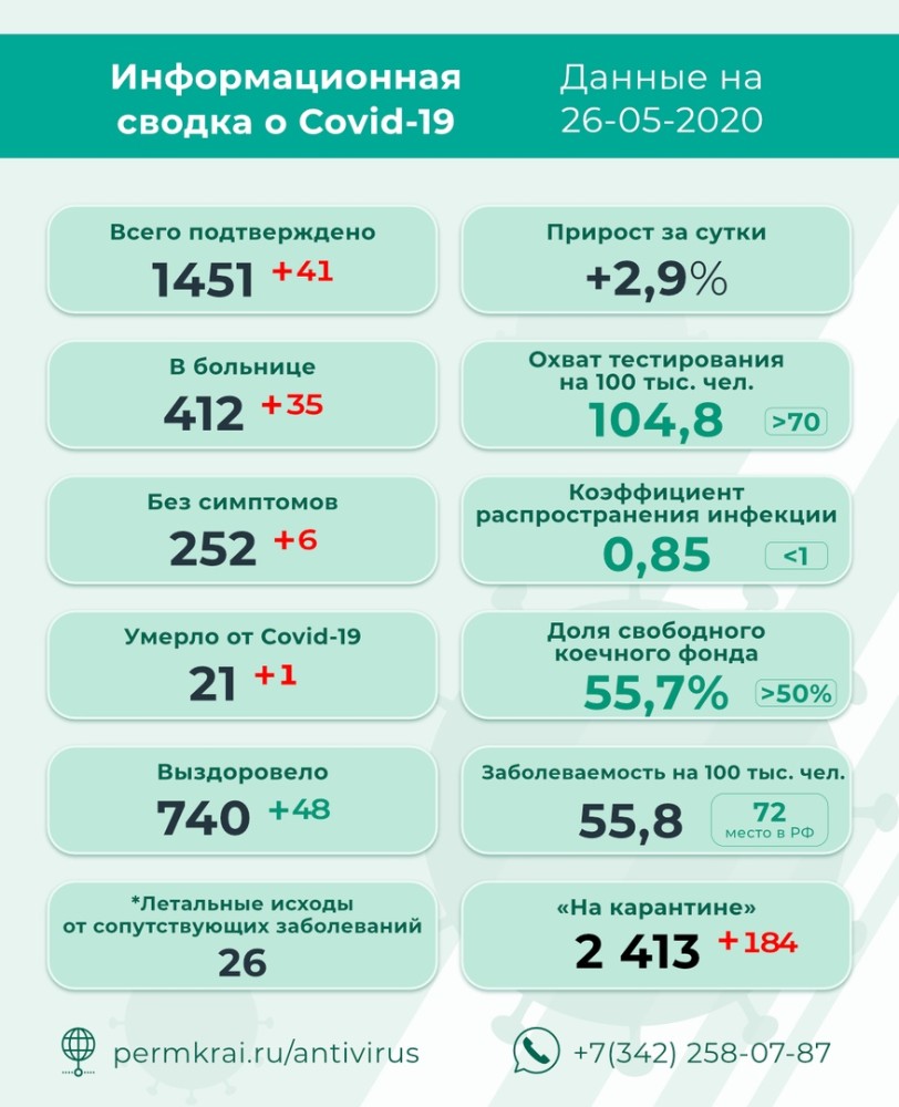 Роспотребнадзор опубликовал данные по исследованиям на коронавирус за предыдущие сутки. В Пермском крае выявлен 41 новый случай заражения COVID-19: 35 человек с симптомами болезни проходят лечение в больницах, 6 – изолированы на дому с бессимптомным протеканием болезни. Таким образом, общее число инфицированных в Пермском крае достигло 1451.