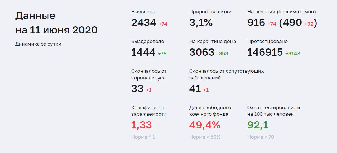 Коэффициент распространения болезни на сегодня составляет 1,33 (на 10 июня - 1,28). Напомним, это один из важных показателей поэтапного снятия ограничений - для второго этапа он должен быть меньше 0,8.