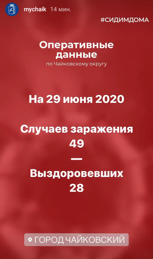 По данным министерства здравоохранения Пермского края на 30 июня общее число подтверждённых случаев заболевания COVID -19 в Чайковском округе по-прежнему остаётся 49 человек, т.е. новых случаев заболевания коронавирусом за прошедшие сутки не выявлено. Число выздоровевших также не изменилось - 28 человек.