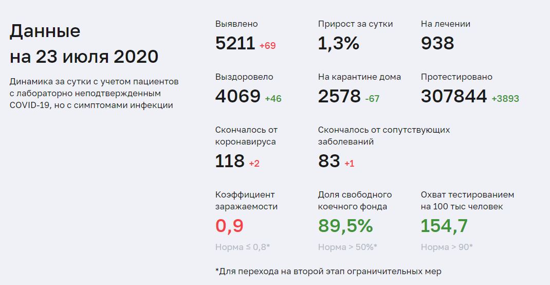 Общее число инфицированных в Пермском крае достигло 5211. Ежесуточный прирост больных составил 1,3% – этот показатель позволяет отследить динамику распространения инфекции в регионе. Коэффициент распространения болезни на сегодня составляет 0,9 (на 21 июля – 1,03).