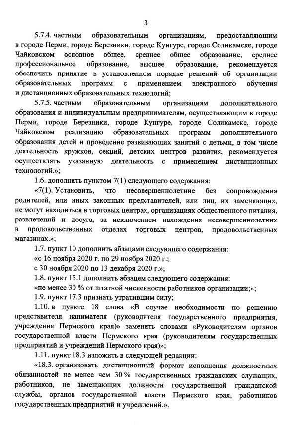 В числе важных изменений — продление до 13 декабря режима самоизоляции для жителей региона старше 65 лет и перевод на режим дистанционного образования школьников с 5 по 11 классы, студентов колледжей и техникумов в пяти крупных городов края, в том числе в Чайковском.