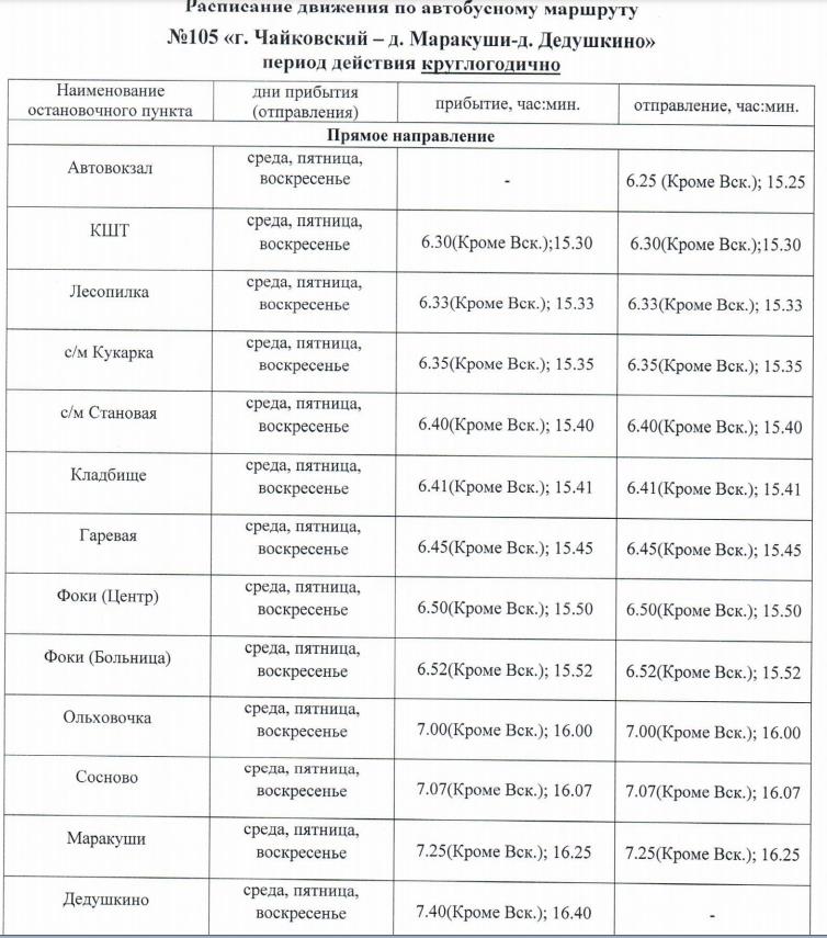 Завтра, 25 июня, движение по автобусному маршруту № 105 «Чайковский – Дедушкино – Маракуши» будет осуществляться по изменённому расписанию. Публикуем его полностью.