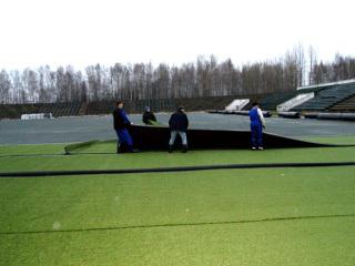 В настоящее время на стадионе, размером 110 на 70 квадратных метра, идут работы по раскатке рулонов.