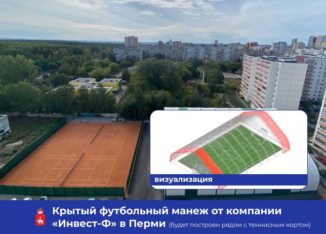 Компания «Инвест-Ф», сообщается на сайте губернатора и Правительства Пермского края, планирует построить в Дзержинском районе г. Перми крытый футбольный манеж. Его площадь порядка 1 тыс. кв. метров. Стоимость инвестпроекта, который планируют завершить в 2028 году, составит 80 млн руб. Новый крытый футбольный манеж разместится на ул. Подлесной и станет вторым спортивным объектом инвестиционной команды. Ранее на ул. Подлесной команда проекта успешно реализовала первый и единственный в Пермском крае проект в рамках муниципально-частного партнерства по строительству спортивного теннисного комплекса «Теннис Парк». В спорткомплексе на безвозмездной основе занимаются группы теннисистов начальной подготовки МБУ «СШОР «Олимпийские ракетки».