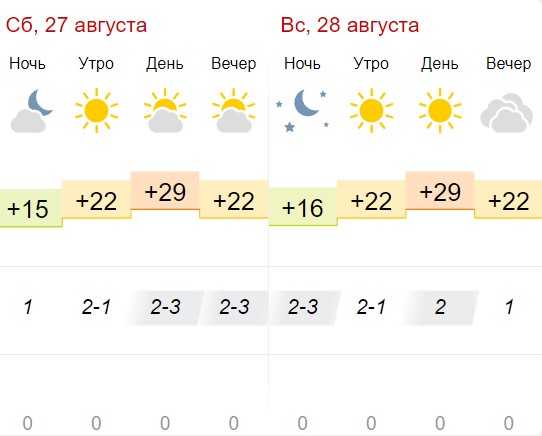 В Чайковском в эти выходные будет преимущественное солнечная погода с максимальной отметкой температуры воздуха +29°. В утреннее и вечернее время выходных стоит ждать более умеренной температуры - +22°. Осадков не ожидается.